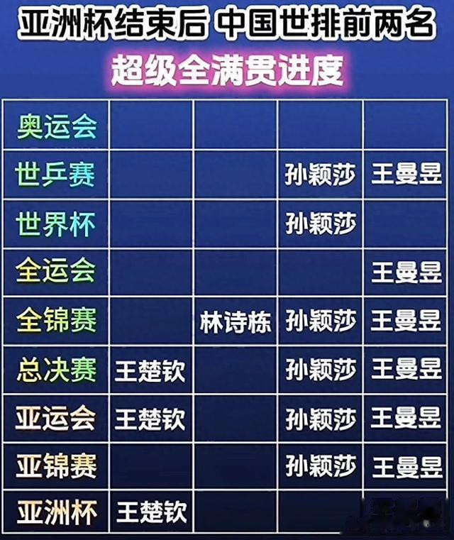 我们细看,发现王曼昱9大赛得到7项,孙颖莎9项拿到6项,王楚钦只有3项,林诗栋只有自己亚锦赛!